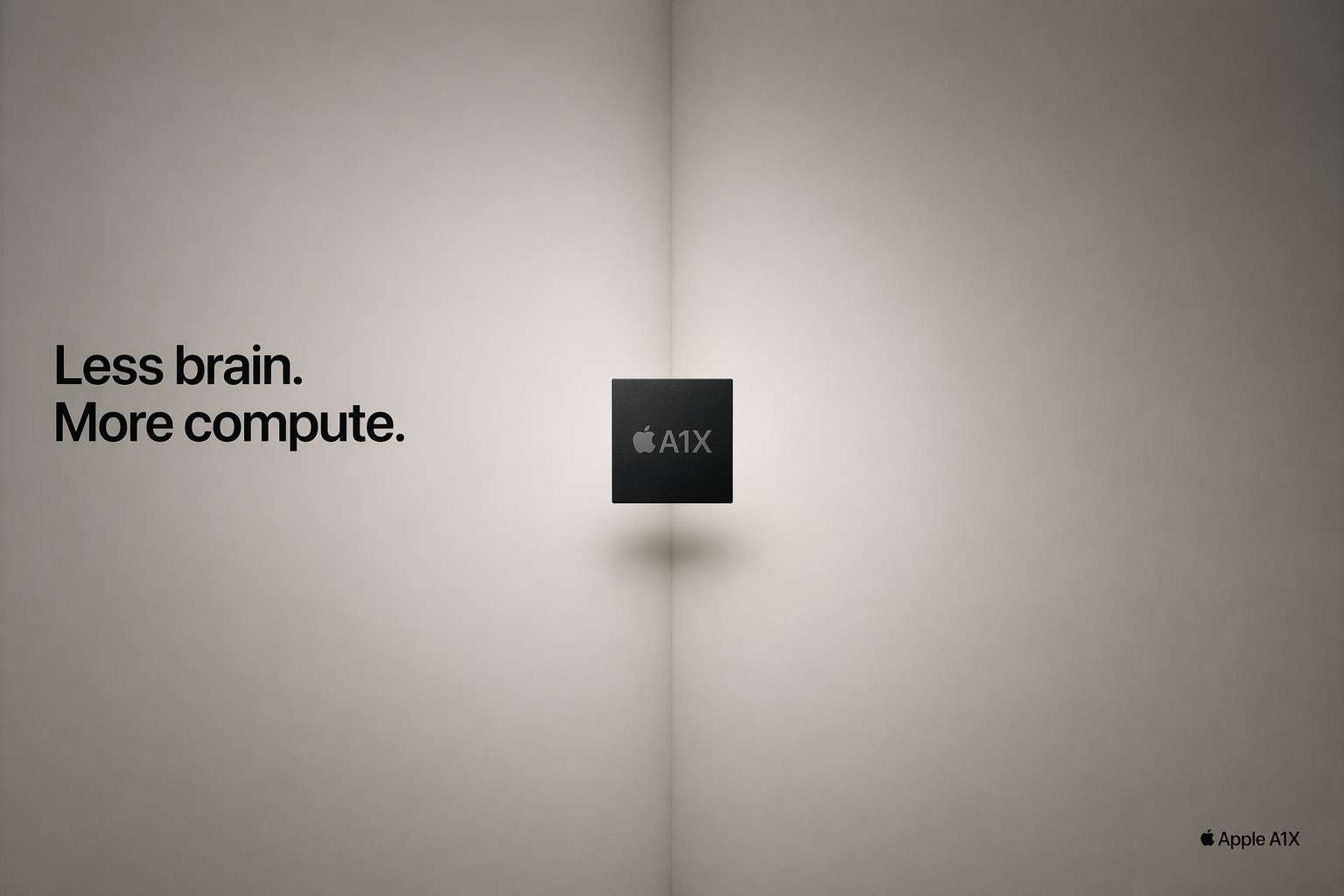 An Apple-style minimalist print ad for a fictional AI chip, a tiny matte-black square chip floating dead-center on a soft warm-grey gradient backdrop, bold sans-serif tagline 'Less brain. More compute.' on the left, a discreet wordmark in the corner, magazine double-spread print quality.