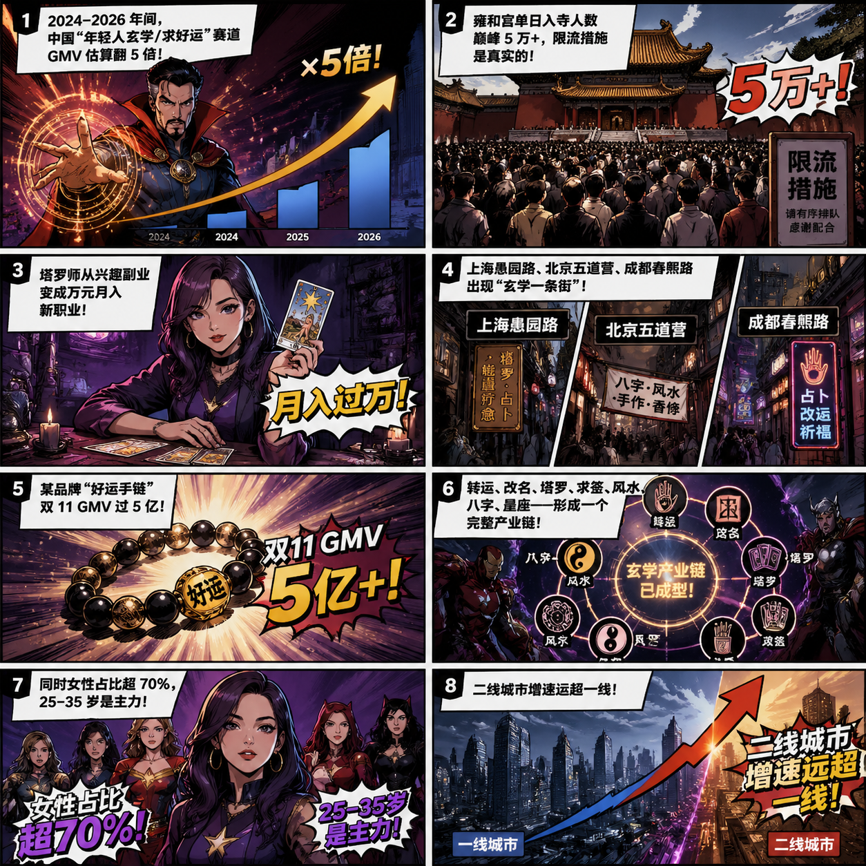 用8格漫威漫威风格表达下面的真实事实: 2024–2026 年间,中国"年轻人玄学/求好运"赛道 GMV 估算翻 5 倍 雍和宫单日入寺人数巅峰 5 万+,限流措施是真实的 塔罗师从兴趣副业变成万元月入新职业 上海愚园路、北京五道营、成都春熙路出现"玄学一条街" 某品牌"好运手链"双 11 GMV 过 5 亿 转运、改名、塔罗、求签、风水、八字、星座——形成一个完整产业链 同时女性占比超 70%,25–35 岁是主力 二线城市增速远超一线