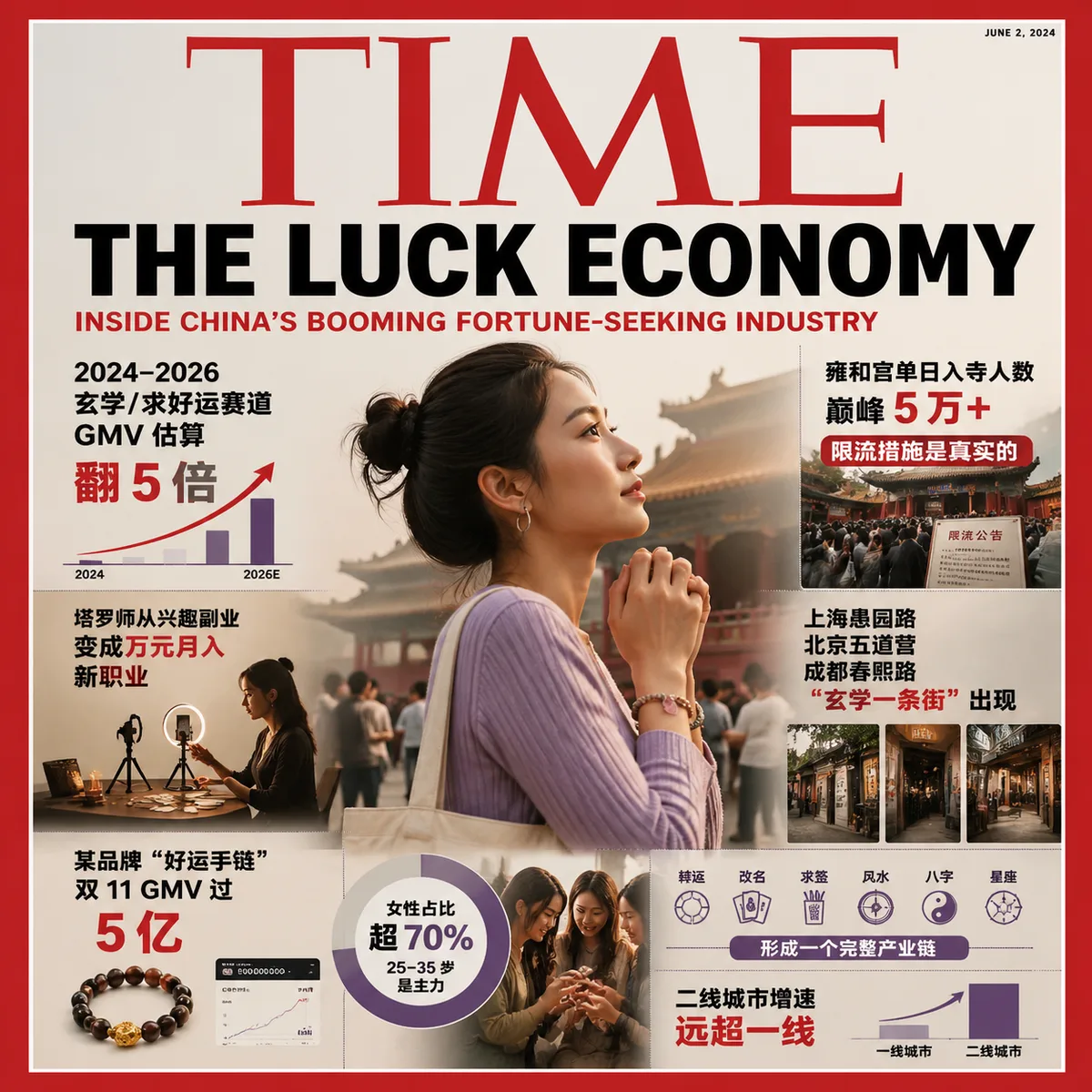 用杂志封面:《Time》风格表达下面的真实事实: 2024–2026 年间,中国"年轻人玄学/求好运"赛道 GMV 估算翻 5 倍 雍和宫单日入寺人数巅峰 5 万+,限流措施是真实的 塔罗师从兴趣副业变成万元月入新职业 上海愚园路、北京五道营、成都春熙路出现"玄学一条街" 某品牌"好运手链"双 11 GMV 过 5 亿 转运、改名、塔罗、求签、风水、八字、星座——形成一个完整产业链 同时女性占比超 70%,25–35 岁是主力 二线城市增速远超一线