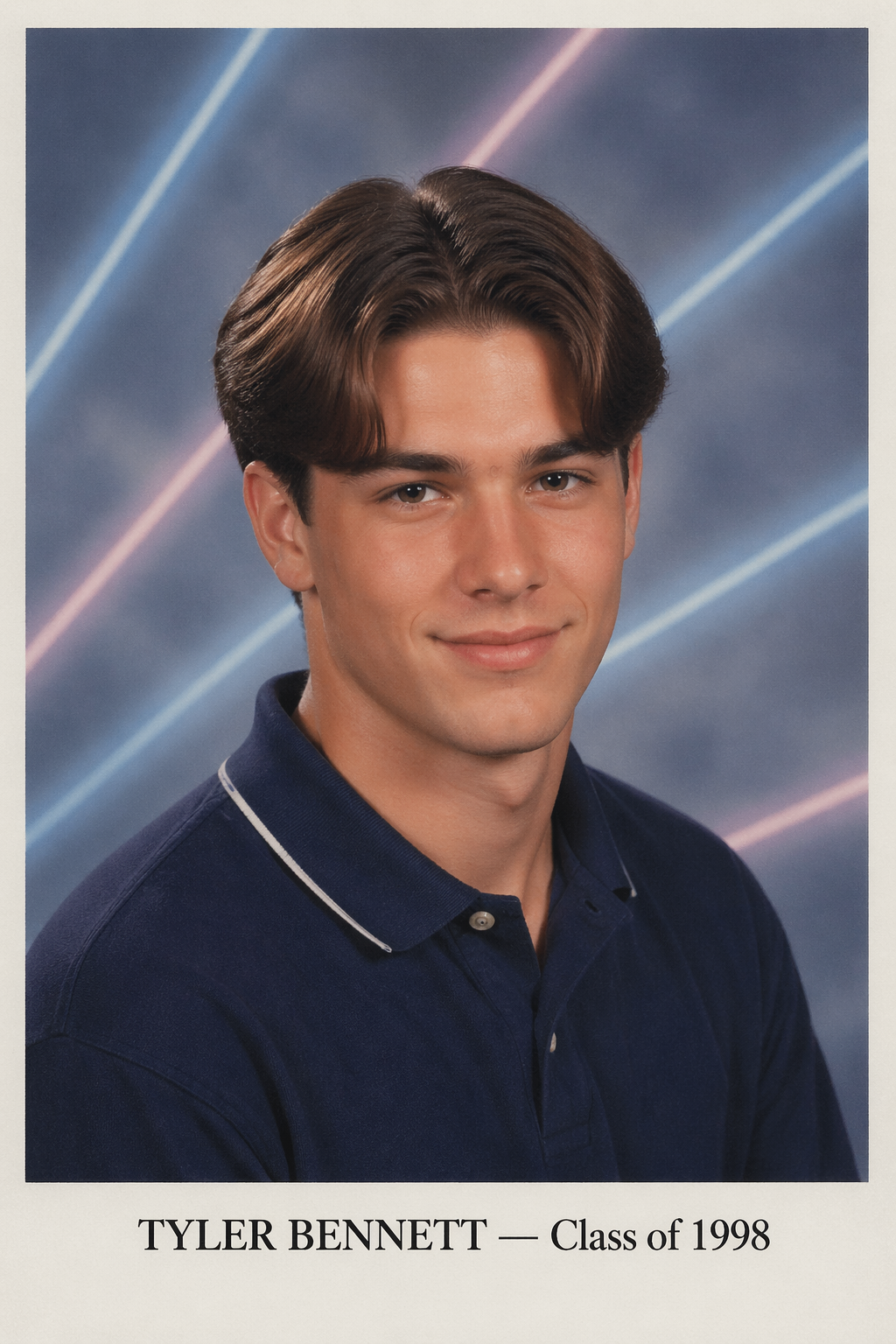 A classic 1990s American high-school senior yearbook portrait, bust framing, studio strobe flash with a soft key light from above-left, head slightly turned toward camera with a subtle closed-mouth smile, dreamy airbrushed cloudy blue and grey laser-beam gradient backdrop behind, slightly faded matte photo-paper quality, a printed name in serif font below the portrait, period-accurate wardrobe and hairstyling. A young man with a mid-90s curtain-parted hairstyle, polo shirt, confident half-smile, name below: 'TYLER BENNETT — Class of 1998'.