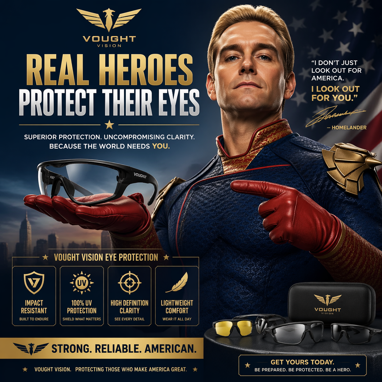 an fancy ads with homelander selling eye protection equipment