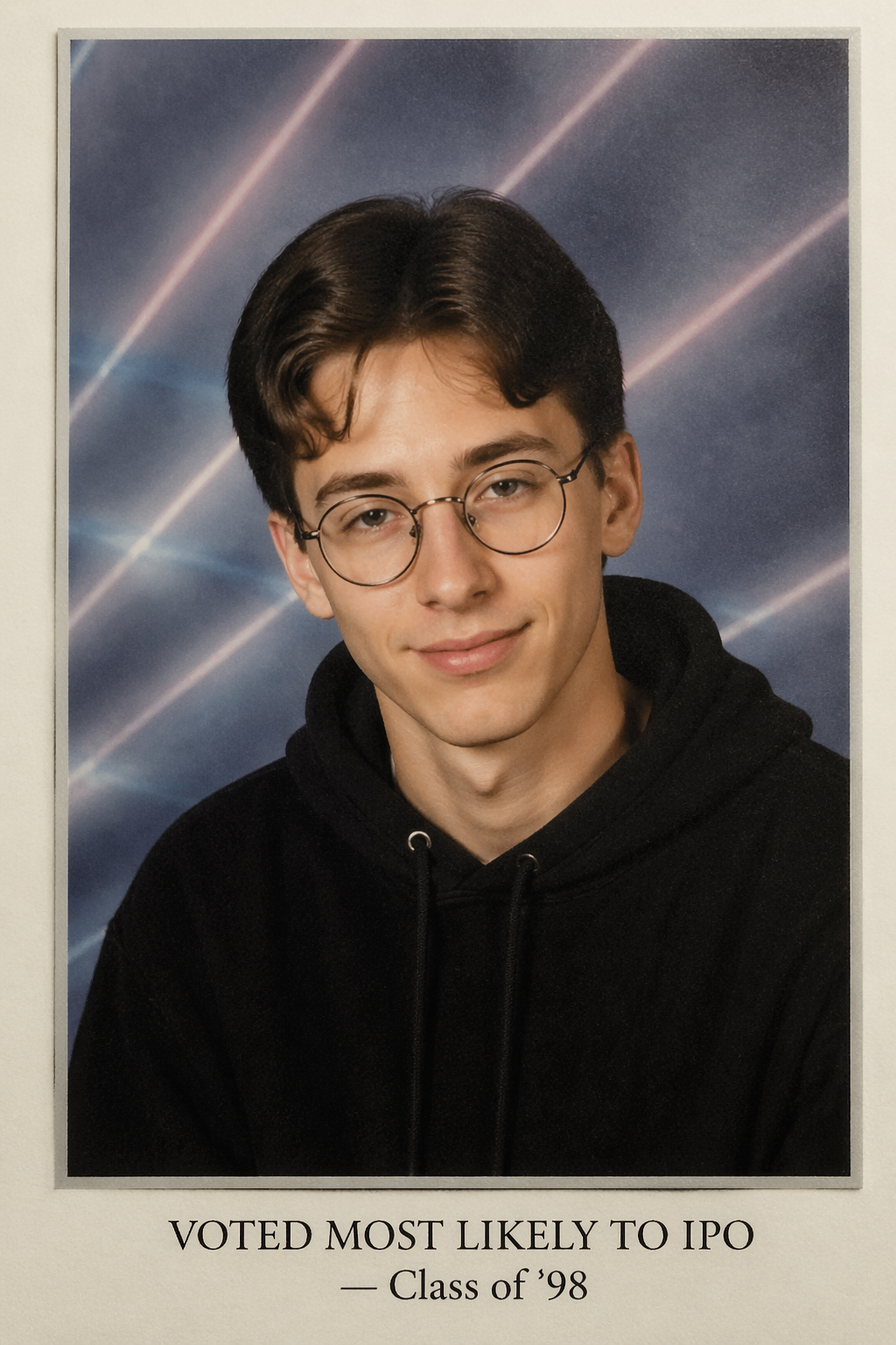 A 1998 American high-school senior yearbook portrait of a nerdy teen in a black hoodie and round glasses, cloudy blue-grey laser-gradient backdrop, soft key light from above-left, subtle half-smile, printed serif name below 'VOTED MOST LIKELY TO IPO — Class of '98', faded photo-paper quality.
