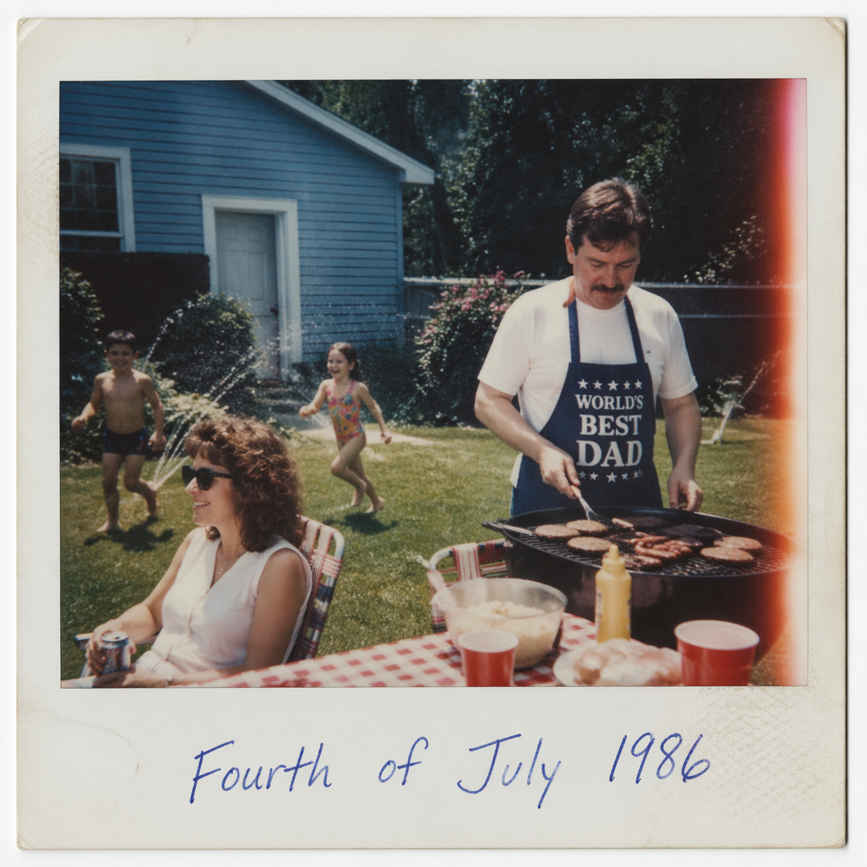 A hyperreal 1980s Americana Polaroid photograph, authentic white Polaroid frame with a wider bottom border, candid everyday scene, dated film color palette with slight red cast and cyan highlights, visible film grain, a gentle light leak on one edge, soft on-camera flash, handwritten caption in blue ballpoint pen on the bottom border, slight dog-ears and fingerprint wear, analog imperfection, deeply nostalgic. A family of four at a suburban backyard BBQ, dad in a 'World's Best Dad' apron grilling, kids running through sprinklers, caption 'Fourth of July 1986'.